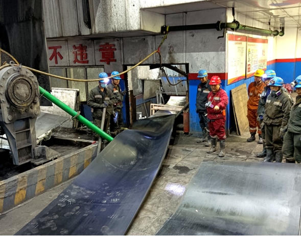 主運輸系統是礦井生產的“大動脈”,原101帶式輸送機使用的鋼絲繩芯阻燃輸送帶因長期高負荷運行,出現磨損、老化等隱患,為確保主運輸系統安全穩定運行,公司領導高度重視,針對年末生產任務緊、冬季施工環境惡劣等情況,提前組織機電管理部與運轉隊編制輸送帶更換方案、落實工具、明確節點、責任到人,并制定周密安全保障措施。
